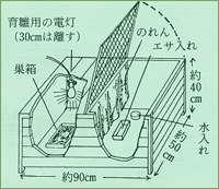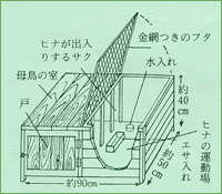 | 人口ふ化のヒナを電灯熱で育てる場合の飼育舎 | ![]() |